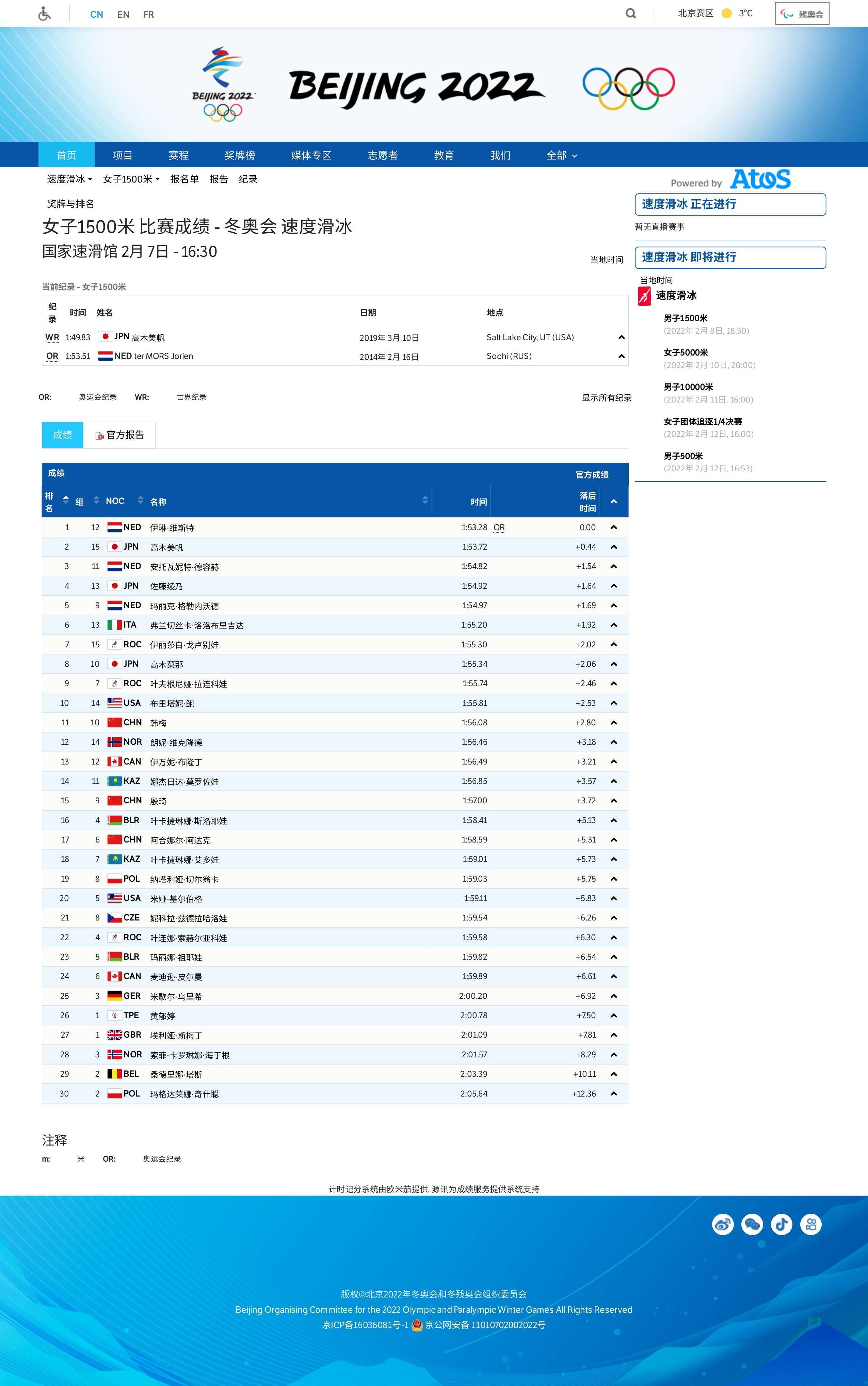 女子1500米 比赛成绩 .2022年北京冬奥会.2023-10-06